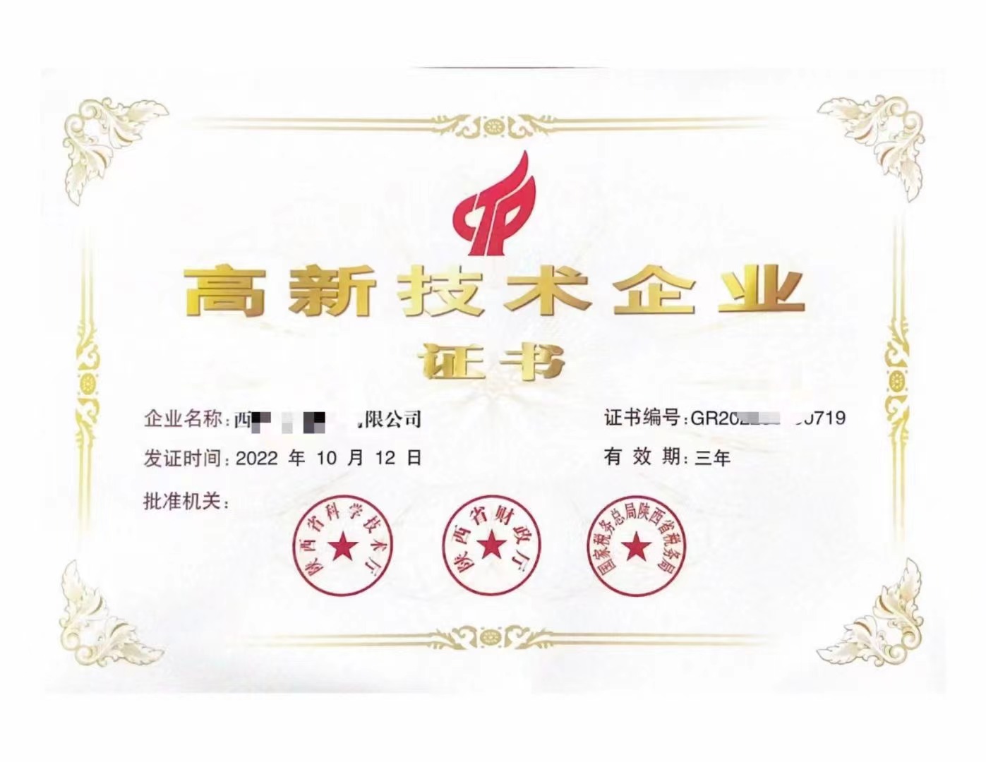 国家高新技术企业初审证书:有限期限是3年